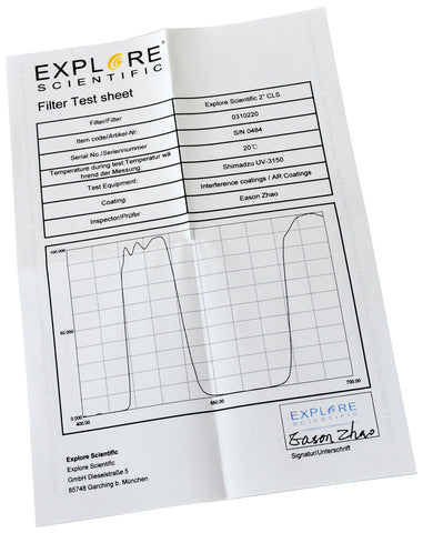 Introducing this High quality and functional Nebula Filter CLS 2.0-inch by Explore Scientific. This Nebula Filter 1.25" CLS Range from 436nm to 536nm with a peak at 488nm. Transmission 98.3%