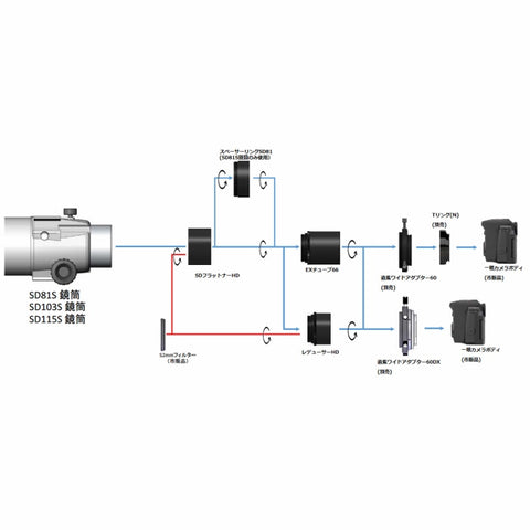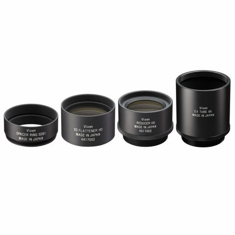 We are Introducing this high-quality and functional SD Reducer HD Kit made by Vixen Optics. It gives a high-performance reducer lens, flattener lens, and (Spacer Ring SD81, EX Tube 66) connecting rings to provide prime focus astrophotography with the optical tubes SD81S, SD103S, and SD115S, enhancing the flat-field performance while reducing by 0.79x focal length. SD series optical tubes supply two different focal lengths, and you can enjoy a prime focus of astrophotography. It improves flat-field performance toward the edge of the field of view by sustaining the original focal length of the optical tubes SD series. It has fully covered the DSLR Camera imaging field with the full-format sensor at a 44mm diameter image circle. Combined with supplied Reducer HD, the focal length will be reduced by 0.79x (f/7.7→6.1) while sustaining in 44mm image circle diameter, broadly improving prime focus over the entire DSLR camera imaging field with the full-format sensor.
